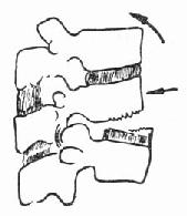 图73-1 前方压缩骨折 (二)旋转损伤 X线检查可见一个椎体在另一个椎体上旋转(图73-2)。有时可见椎间隙变窄,主要为纤维环及髓核损伤。下一个椎体的前缘上角,可被纤维环撕脱一小片,但椎体高度不变。少数仅有单纯椎间隙变窄,无纤维环撕脱。