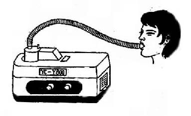 (二)目的 1.治疗呼吸道感染,消除炎症和水肿。 2.解痉。 3.稀化痰液,帮助祛痰。 (三)用物 雾化吸入器,氧气吸入装置1套(不用温化瓶)或压缩空气机1套。 (四)常用药物及其作用 1.抗生素,如卡那霉素,庆大霉素等。 2.解痉药物,如氨茶碱,舒喘灵等。 3.稀化痰液帮助祛痰,如α-糜蛋白酶、易咳净(痰易净)等。 4.减轻水肿,如地塞米松等。 (五)操作方法 1.按医嘱抽药液,用蒸馏水稀释或溶解药物在5ml以内,注入雾化器。 2.能起床者,可在治疗室内进行。不能下床者,则将用物携至床边,核对,向病人解释,以取合作,初次作此治疗,应教给病人使用方法。 3.嘱病人漱口以清洁口腔,取舒适体位,将喷雾器的“1”端连接在氧气筒的橡胶管上,取下湿化瓶,再调节氧流量达6-10L/min,便可使用。 4.病人手持雾化器,把喷气管“5”放入口中,紧闭口唇,吸气时以手指按住“2”出气口,同时深吸气,可使药液充分达至支气管和肺内,吸气后再屏气1-2秒,则效果更好,呼气时,手指移出气口,以防药液丢失。如病人感到疲劳,可放松手指,休息片刻再进行吸入,直到药液喷完为止,一般10-15分钟即可将5ml药液雾化完毕。 5.吸毕,取下雾化器,关闭氧气筒,清理用物,将雾化器放消毒液中浸泡30分钟,然后再清洁、擦干、物归原处,备用。 6.在氧气雾化吸入过程中,注意严禁接触烟火及易燃品。 二、超声波雾化吸入法 超声波雾化器是应用超声波声能, 药液变成细微的气雾,现由呼吸道吸入,达到治疗目的,其特点是雾量大小可能调节,雾滴小而均匀(直径在5μm 以下),药液随着深而慢的吸气被吸入终末支气管及肺泡。又因雾化器电子部分能产热,对雾化液有加温作用,使病人吸入温暖、舒适的气雾。 (一)超声波雾化器的结构 1.超声波发生器 通电后输出高频电能。雾化器面板上操纵调节器有电源开关、雾化开关、雾量调节旋钮。 2.水槽 盛蒸馏水。水槽下方有一晶体换能器,接发生器发出的频电能,将其转化为超声波声能。 3.雾化罐(杯)盛药液。雾化罐底部的半透明膜为透声膜。当声能透过此膜与罐内药液作用,产生雾滴喷出。 4.螺纹管和口含嘴(或面罩)(图14-12)。