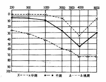 主要症状为进行性听力减退及耳鸣。早期听力损失在4,000Hz处,因此,对普通说话声无明显影响,仅在听力计检查中发现,以后听力损害逐渐向高低频发展,终于普遍下降,此时感到听力障碍(图14-1),严重者可全聋。耳鸣与耳聋可同时发生,亦可单独发生,常为高音性耳鸣,日夜烦扰不宁。