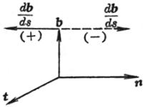 挠率的符号:当点M沿曲线的正向移动时,矢量n反向,则取正号,反之取负号(图(b)