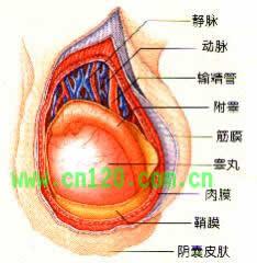 阴囊是男子外生殖器的一部分,是阴茎下方的囊状物,触摸有性快感,儿童时期为皮肤颜色, 成年颜色变暗,并生出颗粒状毛囊,长出稀疏阴毛。阴囊外层为薄皮肤,内层为平滑肌,阴囊可以随环境不同和性兴奋而伸展和收缩从而保护 睾丸,当外界温度较低时,阴囊收缩,睾丸被压向靠近腹部,以防止冻坏睾丸,这时目视阴囊,两颗睾丸不明显,阴囊为紧贴腹下的半球形, 当外界温度较高时,为了散热,这时阴囊松弛舒展,睾丸下垂,这时目视阴囊,两颗睾丸非常明显,用手触摸,很容易摸到阴囊内的睾丸, 并且还可以摸到副睾,输精管,性兴奋时,阴囊也会收缩,把睾丸提起,使睾丸在性交过程中免受挤压。