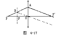 【物像公式】 描述物像位置以及它们和透镜或透镜组的特征量之一(焦距)之间的关系式。对一个薄凸透镜可以认为是由底面朝向透镜中央的许多棱镜的集合,而这些棱镜的顶角是很小的,对于顶角很小的棱镜来说,如果构成棱镜的材料的折射率为n,顶角为A,那么在近轴光线的条件下,其偏向角δ为常数(n-1)A。当棱镜给定后,近轴光线的偏向角δ是不变的。我们可以利用此关系来推导薄透镜的物像公式。如图4-13a所示,设PM为平行光束所任一条光线在M点入射,而OM=h,则出射光线MF′必通过透镜的焦点F′,OF′=f,f为透镜的焦距。根据近轴光线的条件,即f>>h,偏向角近似为
